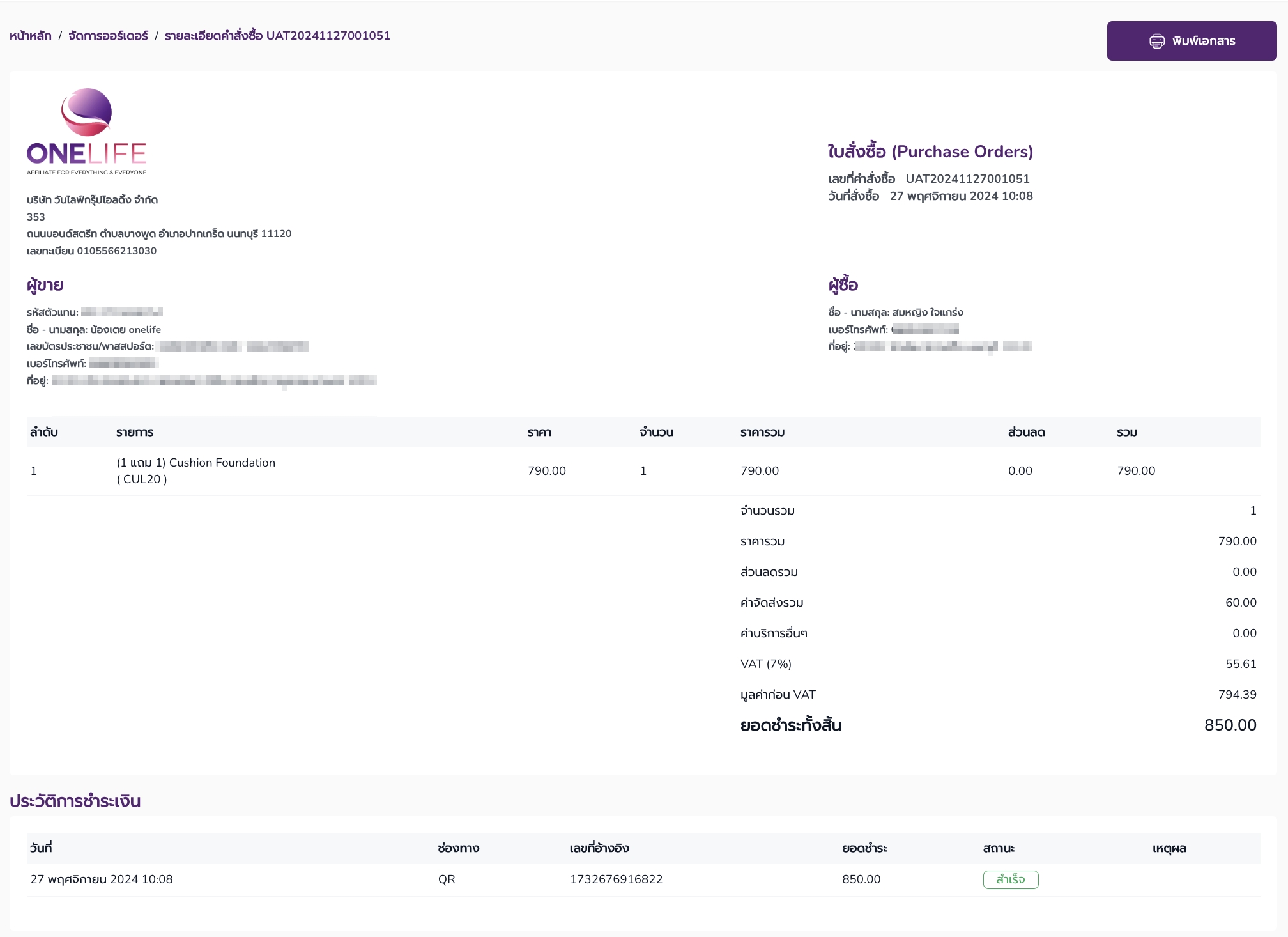 - ผู้ซื้อ: ในส่วนนี้จะบอกรายละเอียดของชื่อ – นามสกุล, เบอร์โทรศัพท์, ที่อยู่