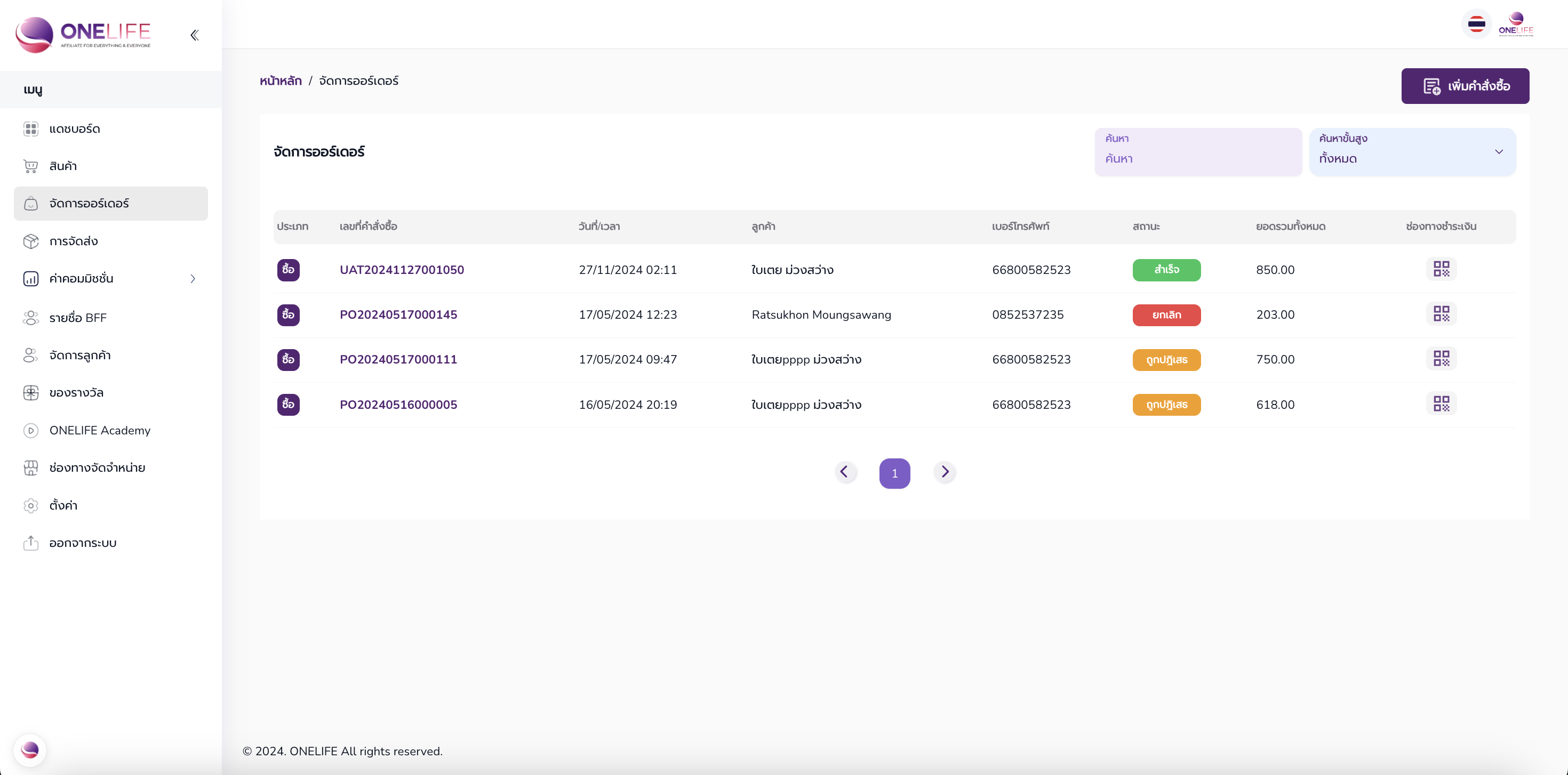 การจัดการออร์เดอร์ สามารถเข้ามาที่หน้าจัดการออร์เดอร์ได้โดย กดที่แถบเมนูเลือกหัวข้อ “จัดการออร์เดอร์” หลังจากที่กดปุ่มดังกล่าว ระบบแสดงหน้าจอจัดการออร์เดอร์ โดยมีข้อมูลแสดง ดังนี้